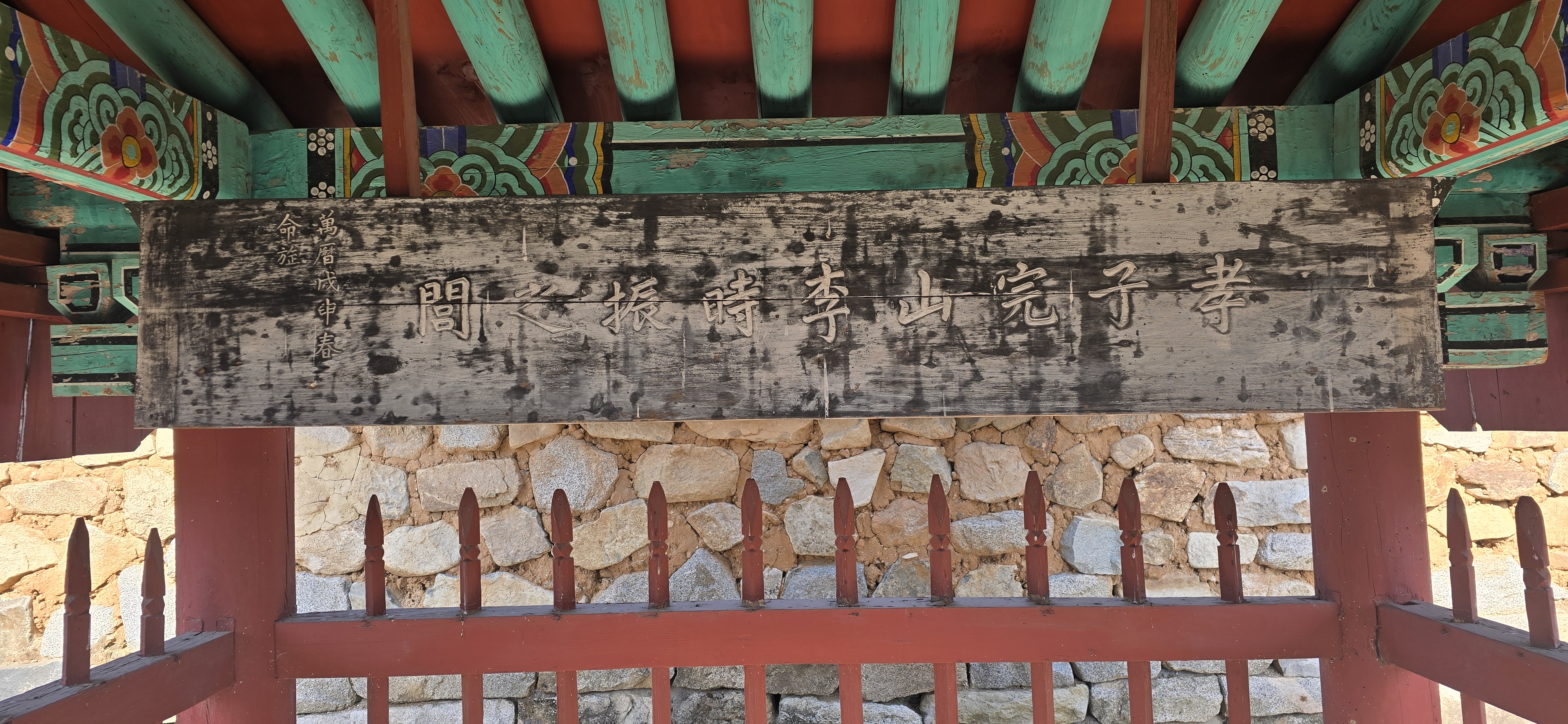 효자문 편액 : 사진 속에 보이는 빛바랜 나무 판에는 '효자 완산 이시진지문(孝子 完山 李時振之門)'이라는 글자가 선명하게 새겨져 있습니다. 오랜 세월의 흔적을 고스란히 머금은 이 편액은 만력 무신년(1608년)에 명을 받아 세워졌음을 알려주고 있습니다.